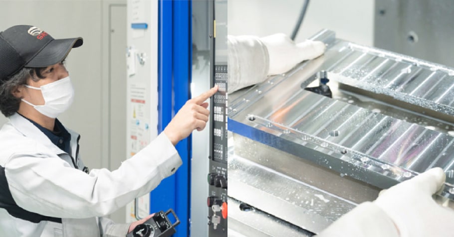 高品質かつ高精度な精密部品の製造・加工を行っています。マシニングセンターに自社開発したバイスチェンジャーを組み合わせるなど、自動化を積極的に推進。多品種変量生産を実現しています。